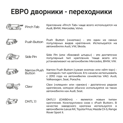 Крепление «Pinch Tab» чаще всего используется на Audi, BMW, Mercedes, Volvo.