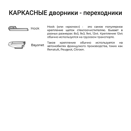 Hook (или «крючок») – это самое популярное крепление щёток стеклоочистителя. Бывает в разных размерах: 8х3, 9х3, 9х4, 12х4. Крепление 12х4 обычно используется на грузовом транспорте.