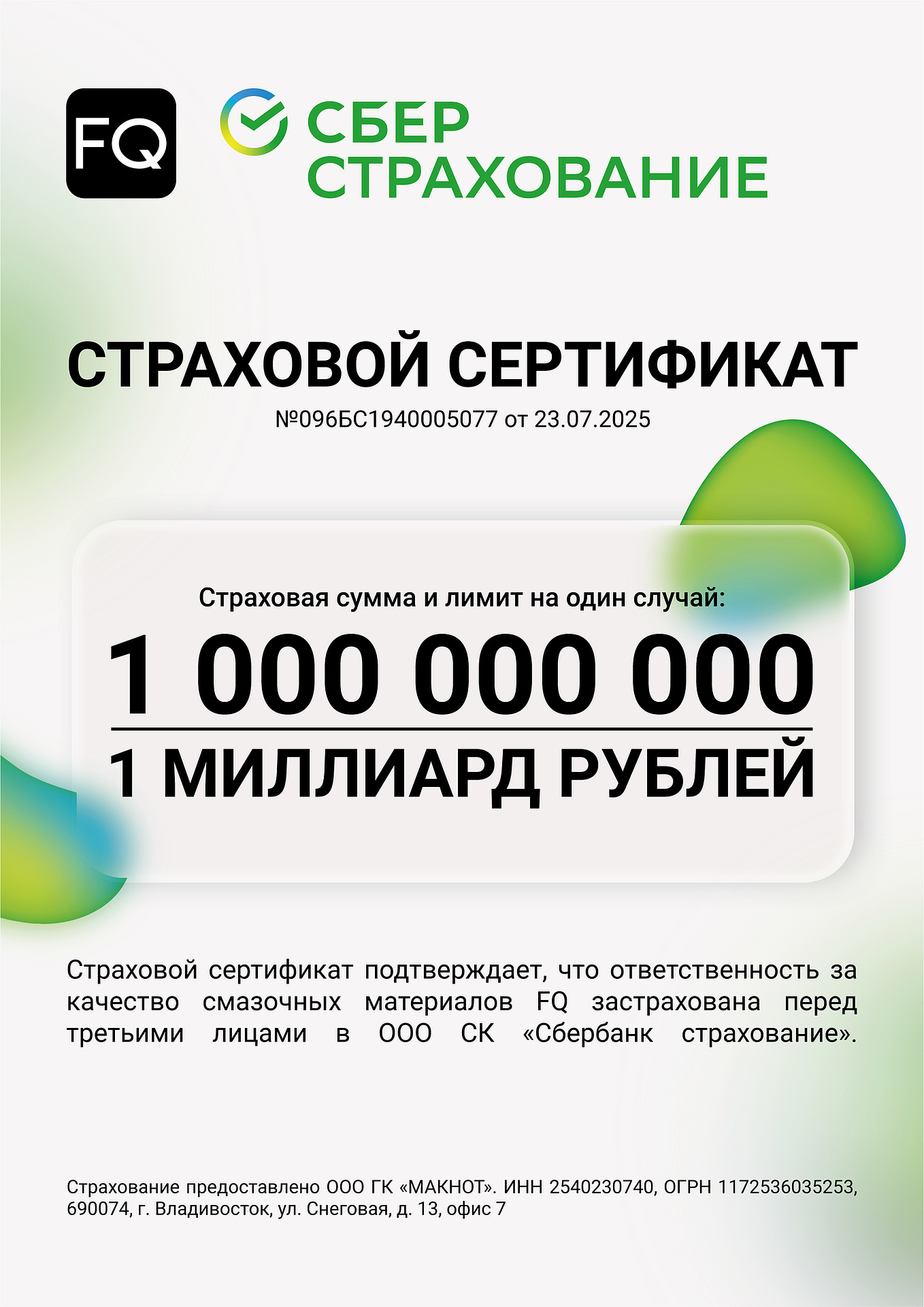 OOO GC "MAKNOT" has taken an important step in guaranteeing the quality of the supplied products - all lubricants of the FQ brand (motor, transmission, hydraulic and other oils) are now insured by OOO IC "Sberbank Insurance" for the amount of 1,000,000,000 rubles.